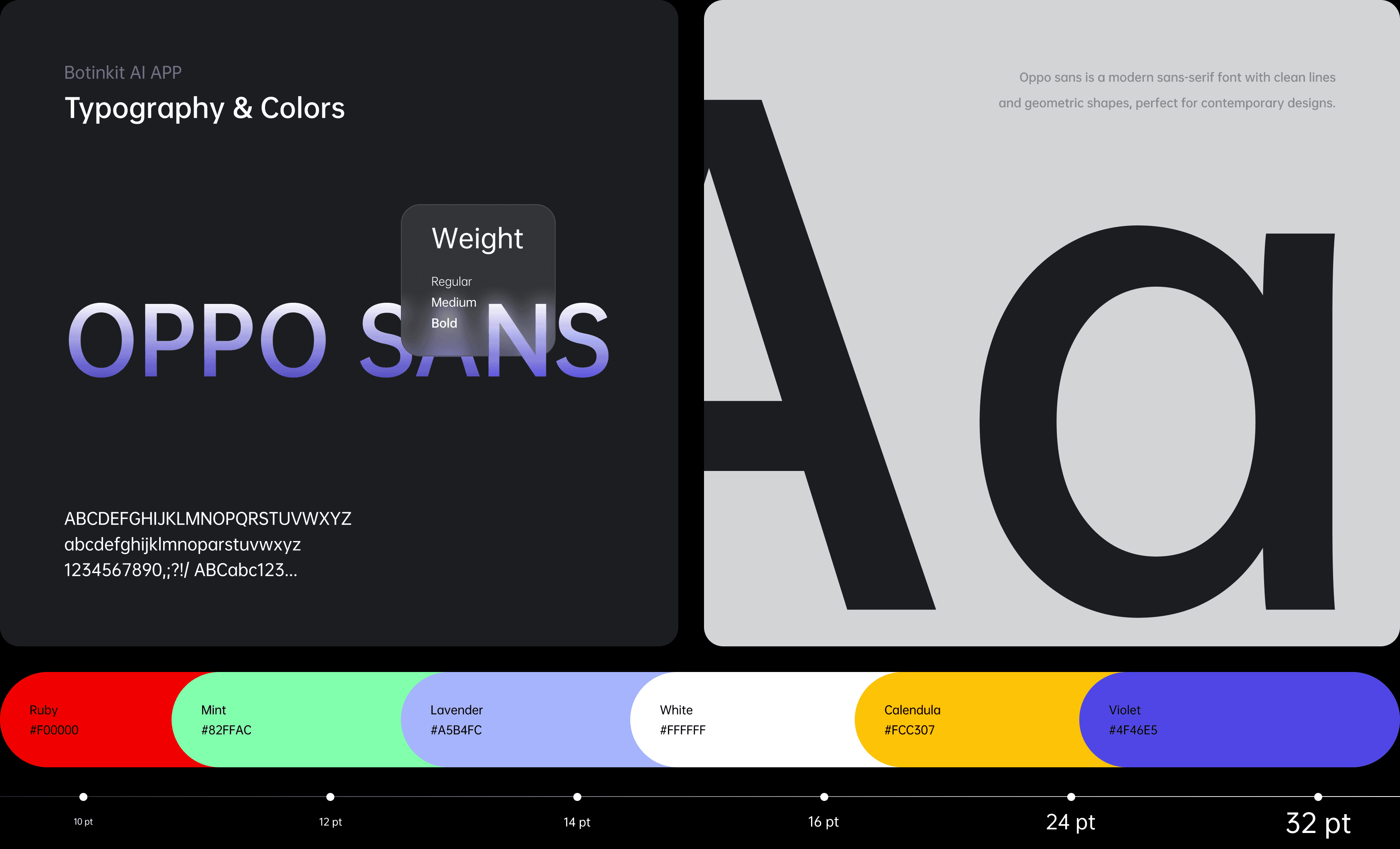 颜色上应用了公司主题色“金盏花黄“与代表科技与神秘的”紫罗兰色“为主色,其他为辅助色去点缀画面并降低用户认知负担;字体上应用了公司通用字体OPPO SANS,通过字重与颜色的组合使用,有效区分信息优先级,引导用户视觉动线。