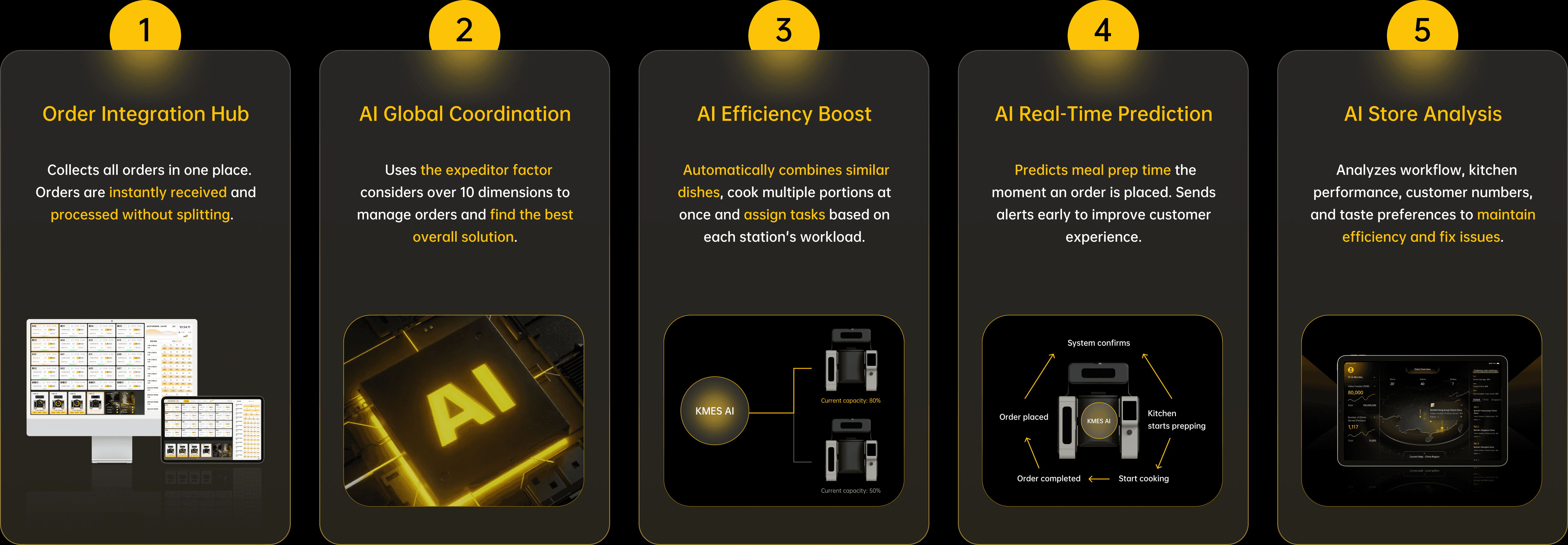 KMES transforms your kitchen into a digital kitchen. This intelligent system uses AI and IoT to dispatch staff, equipment, and orders centrally, replacing manual coordination with data-driven efficiency.